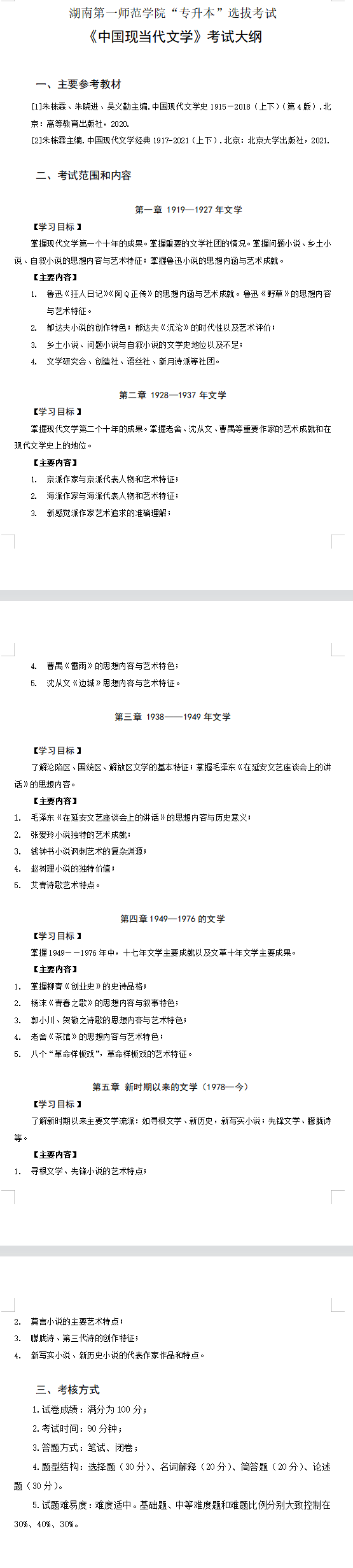 2022年湖南第一師范學(xué)院專升本《中國現(xiàn)當(dāng)代文學(xué)》考試大綱